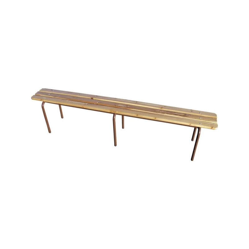 Structure métallique et assise 3 lattes en peuplier vernis. Largeur latte : 70 mm Épaisseur : 20 mm Diamètre structure tubulaire : 25 mm Assise : Hauteur : 450 mm Profondeur : 243 mm Largeur piétement : 355 mm Patin plastique sous chaque pied. Fixation des lattes à la structure par vis et boulon. Nombre maximum de bancs empilés : 5 Piétement métallique, peinture époxy.