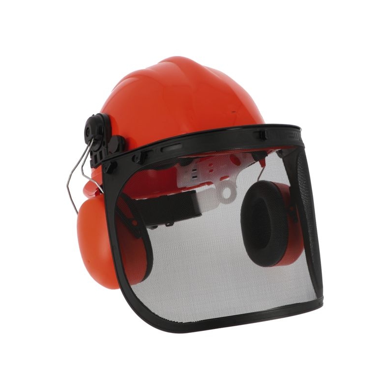 Protection de la tête forestier composée de : - casque Calotte en ABS, 4 points de fixation, coiffe textile, tour de tête en plastique équipé d'un serre-nuque à crémaillère permettant un réglage facile, mousse de confort à l'arrière, bandeau antitranspiration. Coloris : orange Norme : CE Cat II - EN 397 - coquilles antibruit adaptables par encliquetage SNR 25,9 dB. Coloris : orange Norme : CE Cat III - EN 352-3 - porte-visière et visière grillagée. Norme : CE Cat II - EN 1731 Poids : 779 g