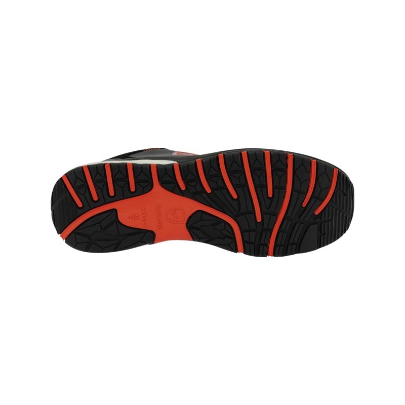 Tige en microfibre et croute de cuir, hydrofuge. Doublure en textile. Première de propreté anatomique et amovible en maille sur mousse PU. Semelle d'usure en caoutchouc / EVA. Semelle antiperforation textile. Embout de sécurité en composite. Poids : 558 g Coloris : noir/orange Pointures : 35 au 48 Norme : CE Cat II - EN ISO 20345 - S3 HRO SRC