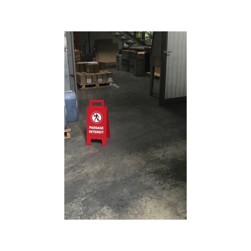 En polypropylène avec renforts de maintien. Utilisation temporaire intérieure et extérieure. Poignée ergonomique, large surface d'impression. Clip de maintien en position ouverte, grande stabilité. Crochets pour chaîne de signalisation. H x l : 600 x 275 mm Épaisseur (plié) : 23 mm