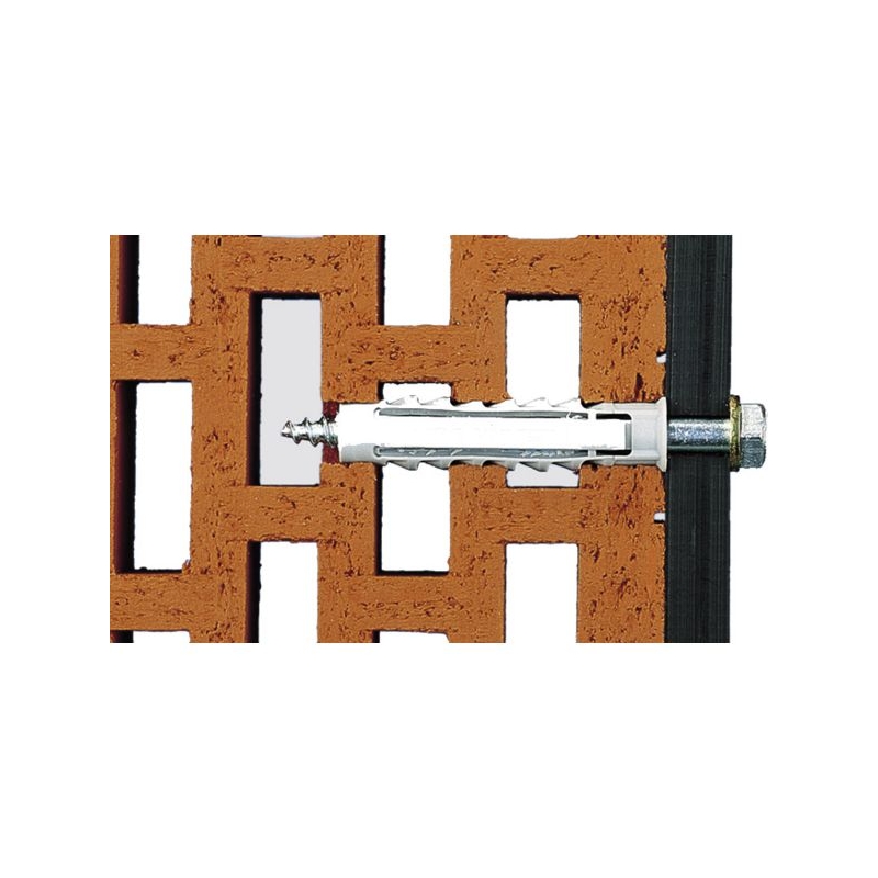 Fixation multi-usage à quadruple expansion. À utiliser dans matériaux pleins ou creux. Pour fixer tableaux, tringles à rideaux, étagères murales légères... Compatible avec les vis à bois, vis pour panneau d'aggloméré, vis autoperceuses. Blocage antirotation grâce aux ergots. Avec collerette.