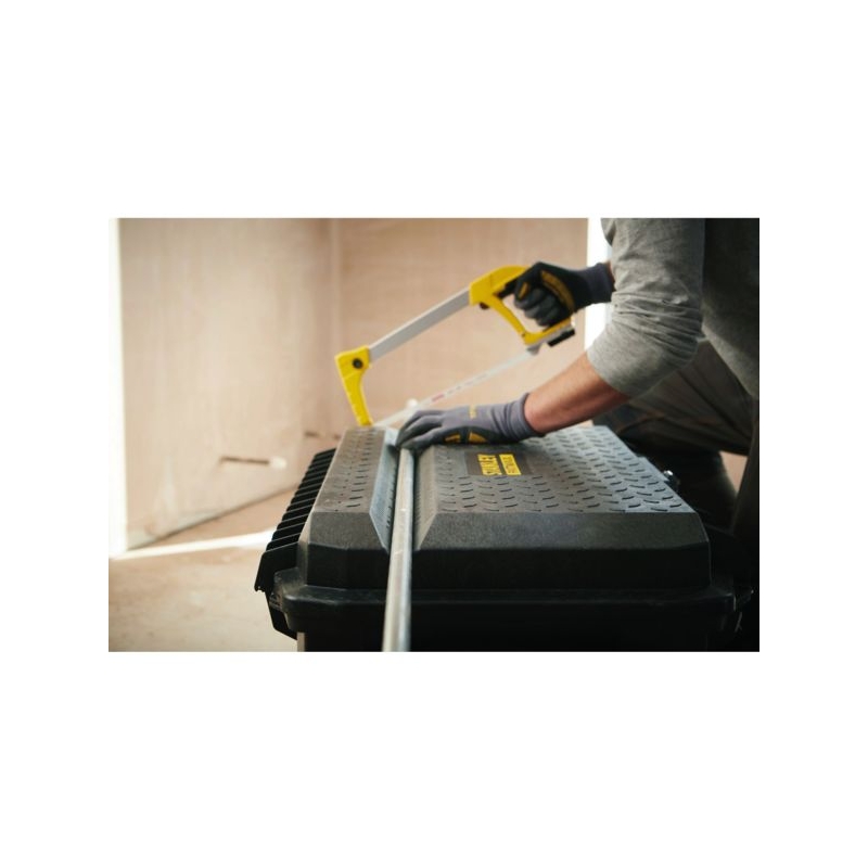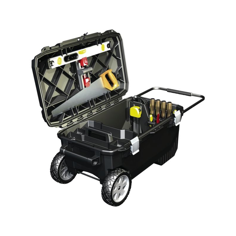En polypropylène. Attaches métalliques anticorrosion et serrure à clés. Roues grand diamètre tout terrain, poignée télescopique bi-matière. Rainure en V pour des découpes d'appoint. Nombreux rangements verticaux et plateau porte-outils intégré. Etanche à l'eau et à la poussière (IP54). Volume utile : 113 l Dimensions : 910 x 520 x 430 mm. Livré sans outils.