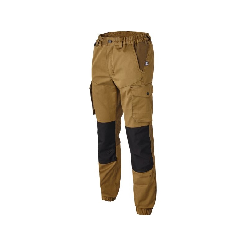 47% coton 35% polyester 18% polyamide, sergé stretch et Cordura®, 260 g/m². Ceinture élastiquée fermée par 1 bouton plastique. Dos couvre-rein. Braguette avec fermeture à glissière. Bas de jambe élastiqué. Renforts genou en Cordura. Poches italiennes, 1 poche passepoilée zippée dos, 2 poches cuisse plaquées avec compartiment stylo + encoche stylo à gauche et compartiment mètre à droite. Accroche clefs insérée sous la ceinture devant droit. Entrejambe 82 cm Coloris : camel, marine, gris, noir Taille : 38 à 52 Entretien : lavage industriel Norme : CE Cat I - EN ISO 15797