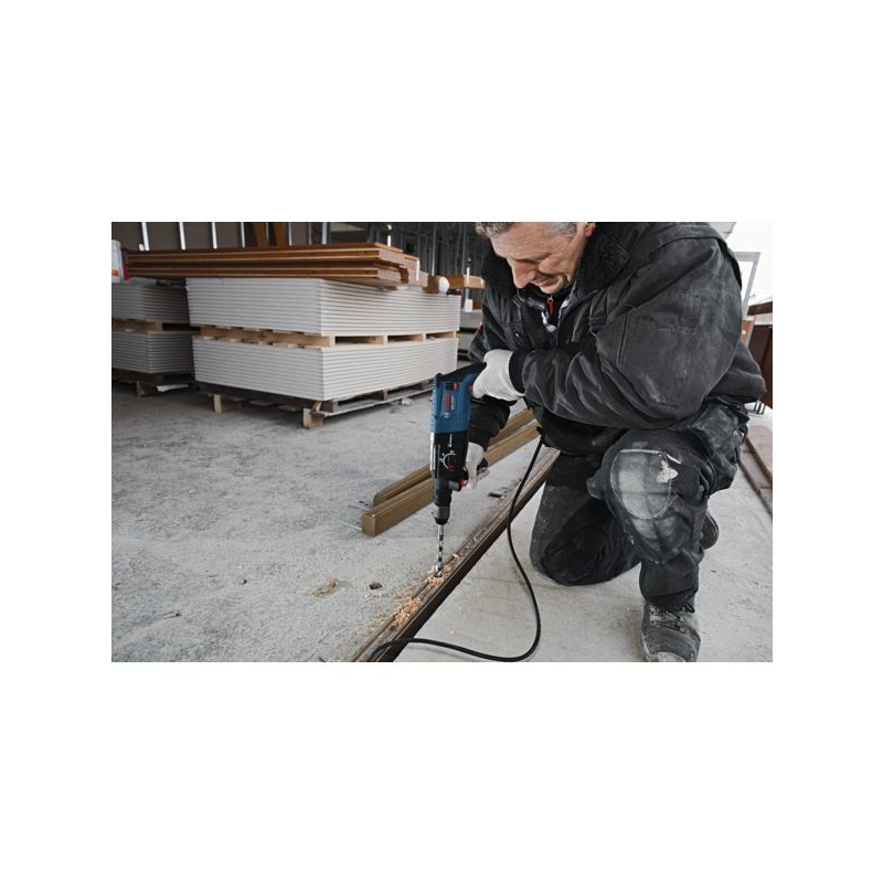 Orientation de l'outil, embrayage de sécurité, stop de rotation, stop de frappe et mandrin interchangeable. Emmanchement : SDS-Plus Puissance : 880 W Puissance de frappe : 3,2 J Vitesse : 900 tr/mn Cadence de frappe : 4000 cps/mn Taux de vibrations : 11 m/s² Poids : 3,100 kg Livré en coffret L-Case avec poignée supplémentaire, mandrin Quick-Change, mandrin interchangeable SDS-Plus, jauge de profondeur.
