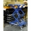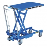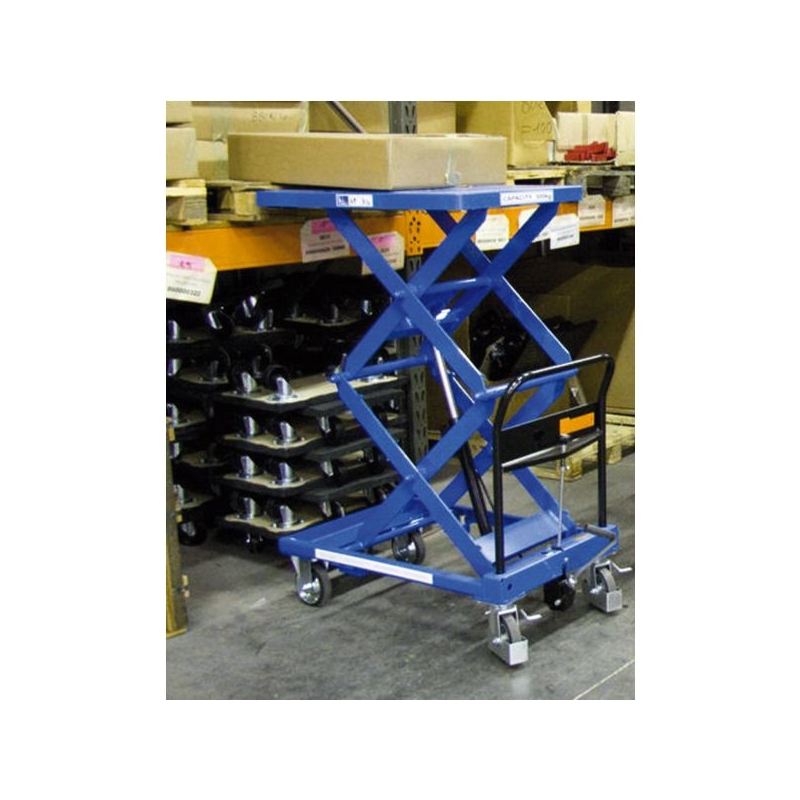 Destinée à des utilisations intensives. Levée hydraulique par pédale à pied. Descente 2 vitesses, commandée par une manette montée sur l'arceau de poussée. Roues caoutchouc Ø 100 mm, 2 fixes + 2 pivotantes dont 1 à frein. Dossier repliable sur modèle 150 kg. Livrée montée.