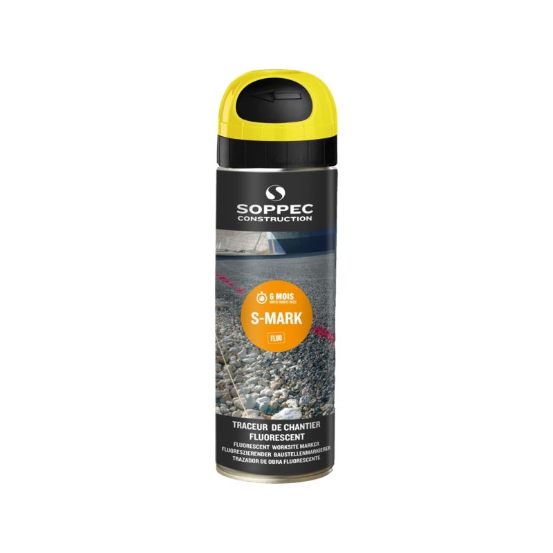 Marquage fluorescent provisoire Haute luminosité. Utilisation marquage au sol, voiries, terrassement, canalisations, constructions, installations électriques. sur tous types de supports même humides. Durée de marquage : 6 mois Aérosol : 650 ml / 500 ml net
