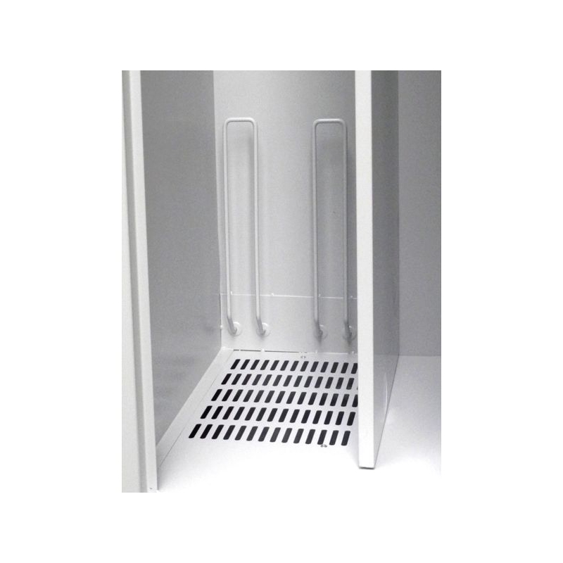 Pour sécher les vêtements de travail. Temps de séchage de vêtements humides estimé en 4-5h. En tôle acier, peinture époxy avec traitement anti-corrosion. Pieds avec vérins de réglage. Tablette soudée, penderie avec cloison de séparation pour vêtements de ville et vêtements de travail. Porte renforcée, fermeture par verrou cadenassable. Aérations. Vestiaires connectables en série. Débit d?air : 150 m³/h Temporisation : 5 h L x H x P : 800 x 1940 x 490 mm Options, version 1000 W et sur socle banc, sur consultation.
