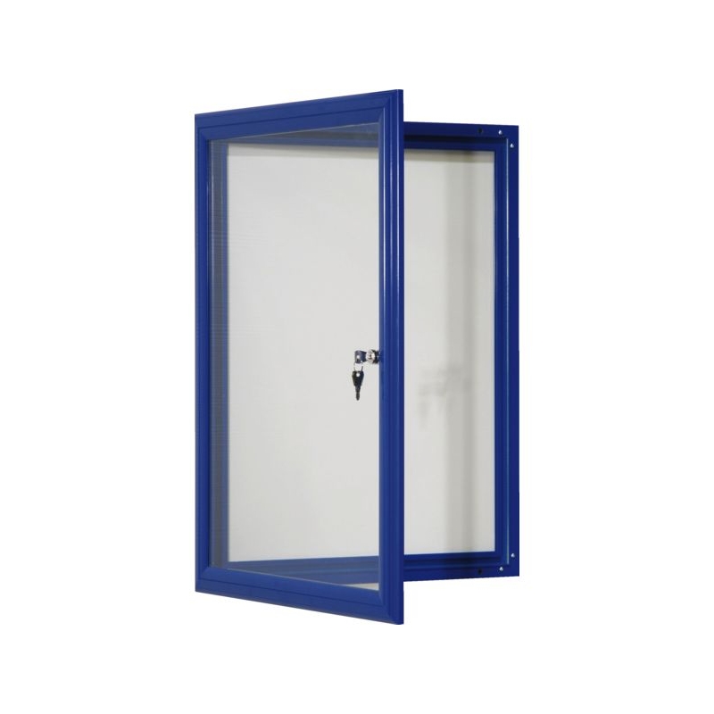 Vitrine réversible avec fond tôle laquée électrozinguée (affichage magnétique). Porte battante démontable avec charnière inox. Encadrement aluminium anodisé, façade verre Sécurit 4 mm. Fermeture par serrure dans le vitrage. Fixation murale 4 points. Épaisseur hors-tout : 35 mm Épaisseur utile : 21 mm Existe en noir, gris et rouge.