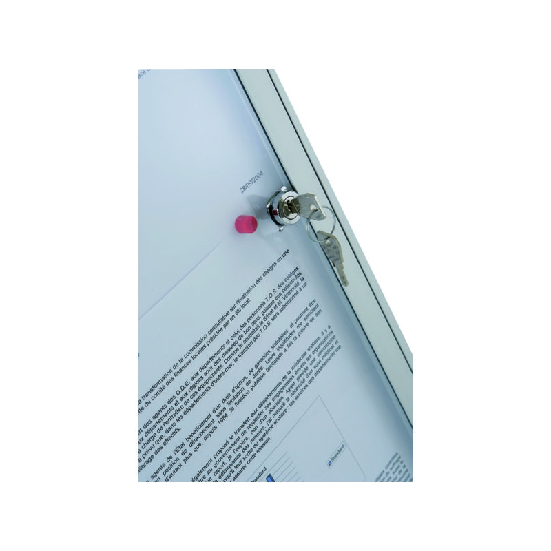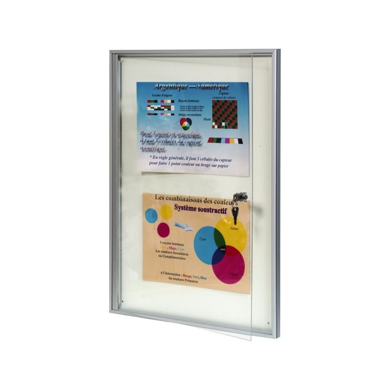 Porte battante, fermeture par serrure à clé avec pose à droite. Profil alu anodisé naturel, façade plexiglas avec entourage à partir du format 6 feuilles. Fond tôle blanc pour affichage magnétique. Fixation murale 4 points. Absence d'entourage de porte pour le format 4 feuilles. Épaisseur hors-tout : 20 mm Épaisseur utile : 12 mm
